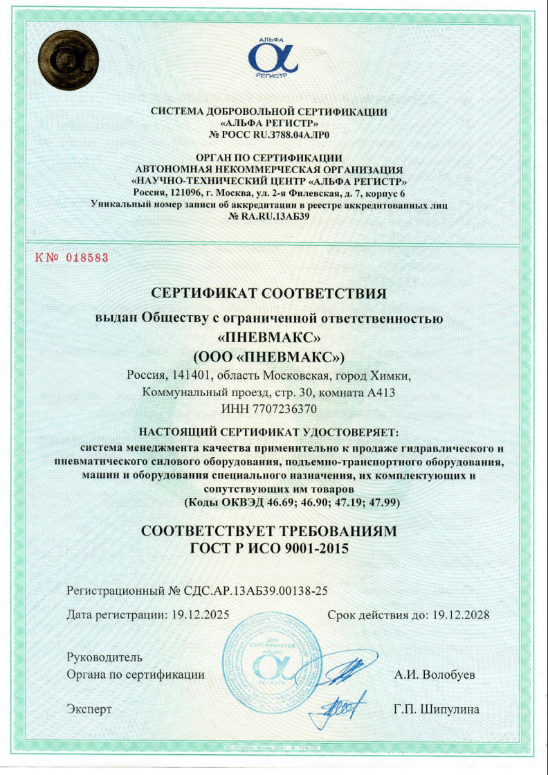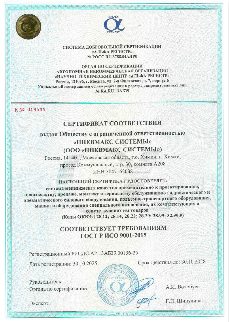 Компания ПНЕВМАКС прошла добровольную сертификацию в системе «Альфа Регистр». Сертификация подтверждает системный подход компании к организации процессов и взаимодействию с партнёрами.