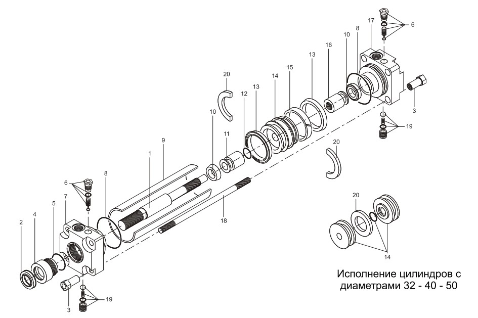 | 2 | Диаметр поршня | 32, 40, 50, 63, 80, 100, 125, 160, 200 мм |