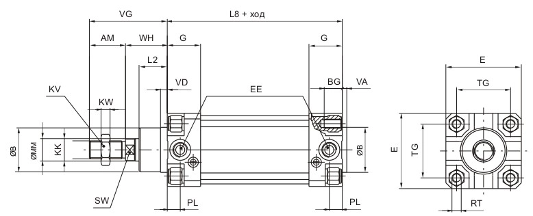 Пневмоцилиндры с квадратным поршнем обеспечивают хорошее противодействие поворачиваемости штока и высокую точность позиционирования штока с нагрузкой. Являются прекрасной заменой сборки пневмоцилиндр плюс дорогостоящие направляющие. Основные размеры соответствуют стандарту ISO 15552.