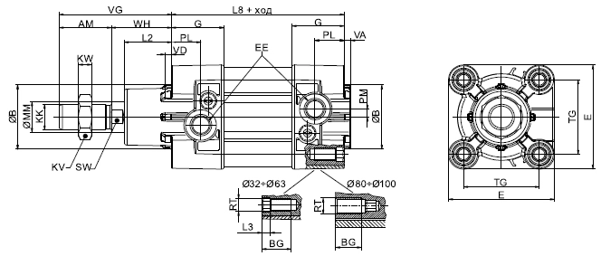 | 2 | Диаметр поршня | 32, 40, 50, 63, 80, 100, 125, 160, 200 мм |
