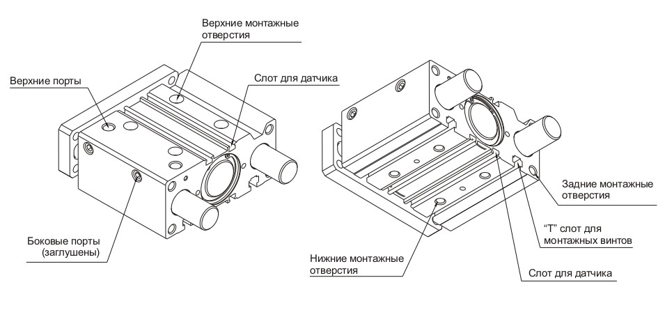 Монтаж цилиндра может быть выполнен с использованием Т-слотов или отверстий на любой из трех сторон.