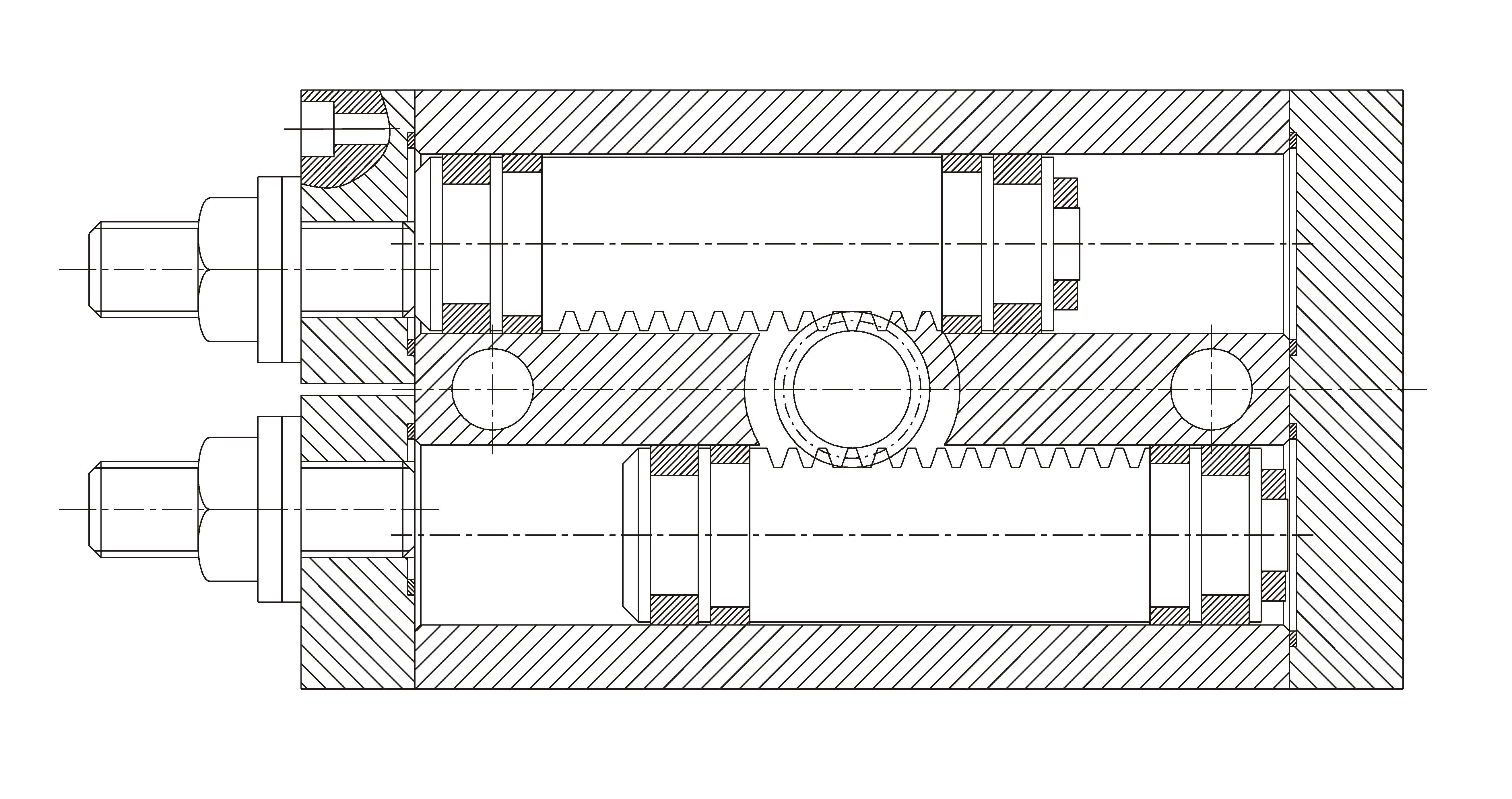 - Выполнен по схеме с двумя зубчатыми рейками, которые поворачивают шестерню.