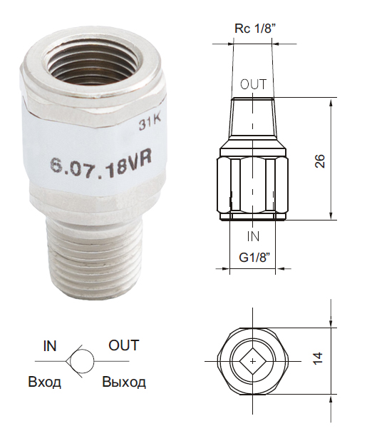 6.07.18VR - Клапан обратный компактный, наружная резьба R1/8", внутренняя резьба G1/8", Viton