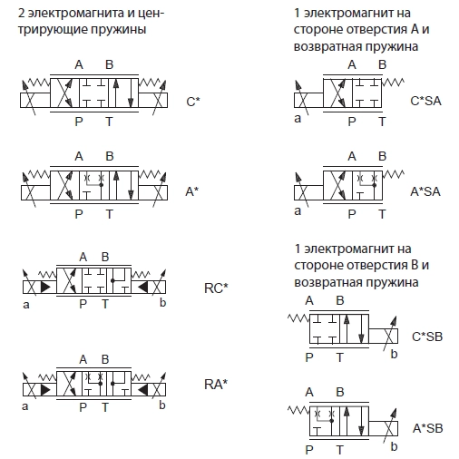 С = закрытые центры A= открытые центры RС = закрытые центры (только для DSPE7G, DSPE8G и расхода 150/75, 300/150, 500/250) RA = открытые центры (только для DSPE7G, DSPE8G и расхода 150/75, 300/150, 500/250) |