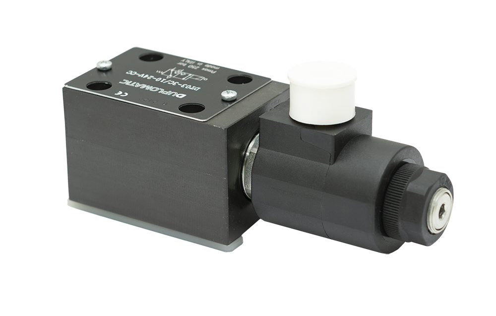 DT03-3C/10/24V-CC — 3/2 Н.З. распределитель клапанного типа с электромагнитным управлением (=24 В), рассчитанный на 250 бар и 25 л/мин. Стыковой монтаж ISO 4401‑03 (CETOP 03), прямое действие и коническое седло обеспечивают герметичность в закрытом положении и устойчивость к загрязнению; катушка маслозаполненная, 100% ED, IP65 при корректной установке разъёма.