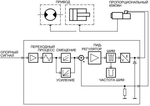 - Ступень широкоимпульсного модулятора (ШИМ) блока питания электромагнита позволяет снизить гистерезис клапана, тем самым улучшая точность управления.