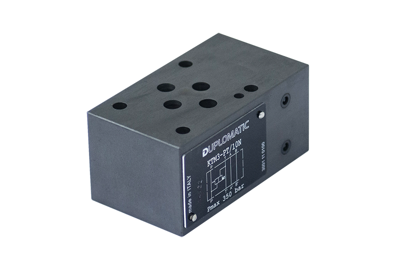 Плита KTM3-PT/10N применяется для установки клапана КТ08 между каналами Р и Т, что позволяет реализовать функцию разгрузки. Стальной корпус гарантирует прочность и устойчивость к давлению. Компактное исполнение облегчает интеграцию в стандартные блоки CETOP 03.