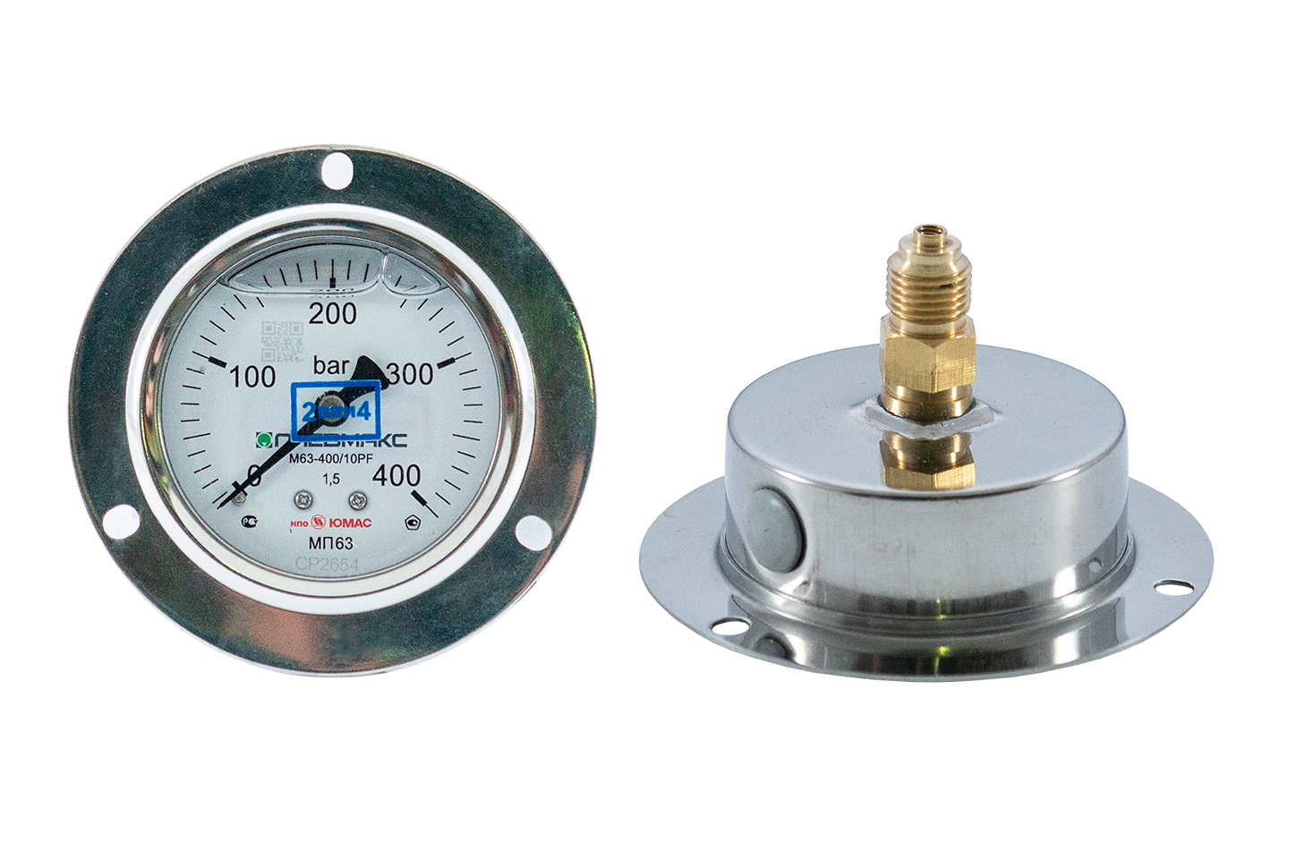Для панельного размещения на установках высокого давления применяют M63-400/10PF_(без поверки). Осевое присоединение сзади с фланцем обеспечивает аккуратную установку в щит, а диапазон 0–400 бар позволяет контролировать силовые гидроконтуры без оформления поверки.