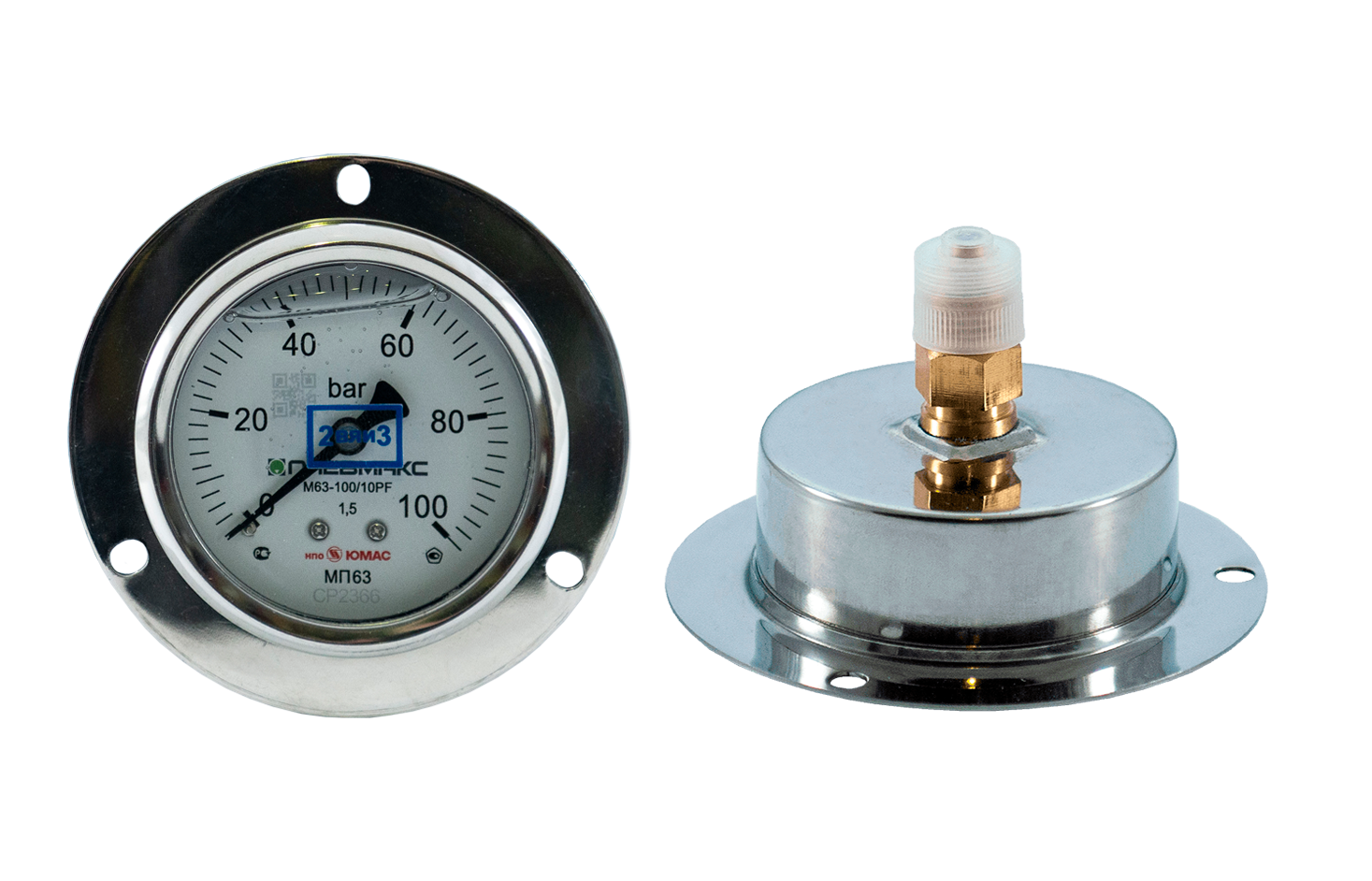 M63-100/10PF - Манометр вибростойкий, 0-100 бар, фланец, присоединение осевое сзади, наруж. резьба G1/4"