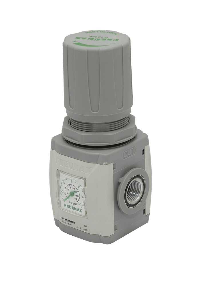 T171BRMD - Регулятор давления модульного монтажа, G1/4", 0...12бар, 1500 нл/мин, технополимер, поток СЛЕВА НАПРАВО, встроенный манометр