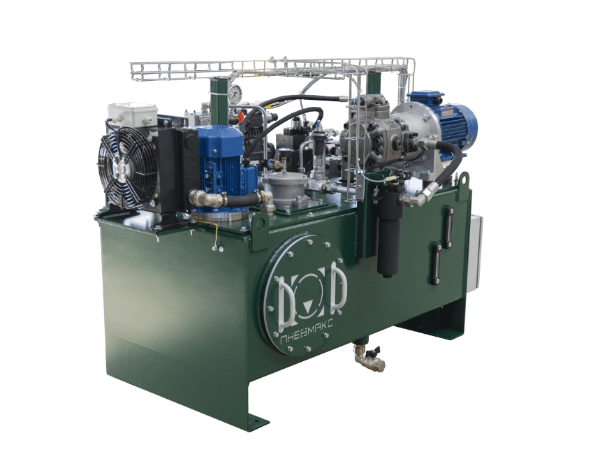 В качестве основного силового агрегата использована мотор-насосная группа, состоящая из регулируемого пластинчатого насоса и электродвигателя. Контур кондиционирования рабочей жидкости состоит из водяного теплообменника и отдельного винтового насоса.