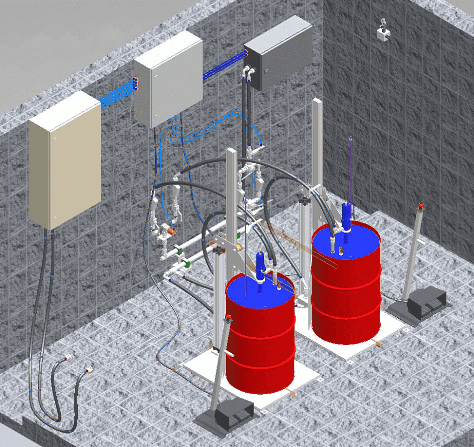 CTR-KV-C0025 – Cистема двухлинейной смазки для 3-х контуров, 2 пневматических бочковых насоса с системой извлечения на базе пневмоцилиндра, в сборе со шкафом управления и аппаратурой.