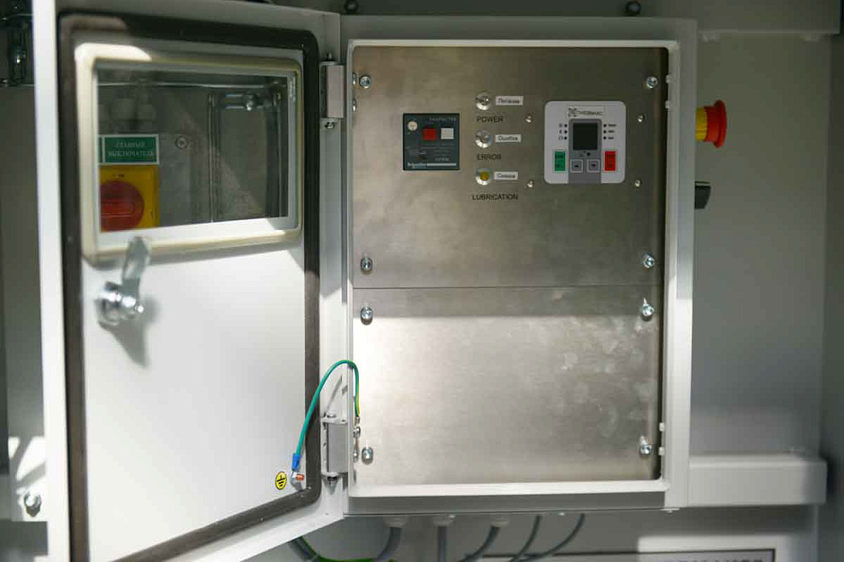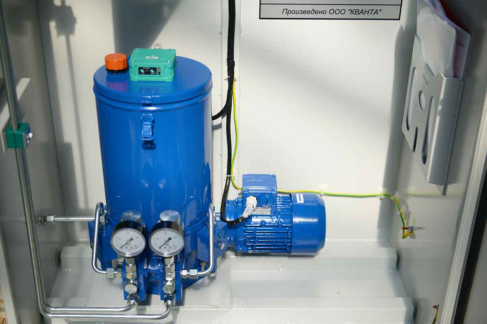 Гидравлический блок с системой управления смонтированы в металлический шкаф со степенью защиты IP65, предназначенный для работы в высокоагрессивной (пылевой) среде. Штуцер для заправки смазки в бак станции смазки расположен снаружи гидравлического блока, что позволяет минимизировать открытие металлического шкафа и, соответственно, уменьшить количество внутренних загрязнений внешней агрессивной средой. На гидравлическом блоке установлена цветовая и звуковая сигнализация режимов работы и аварийных состояний (предупреждений).