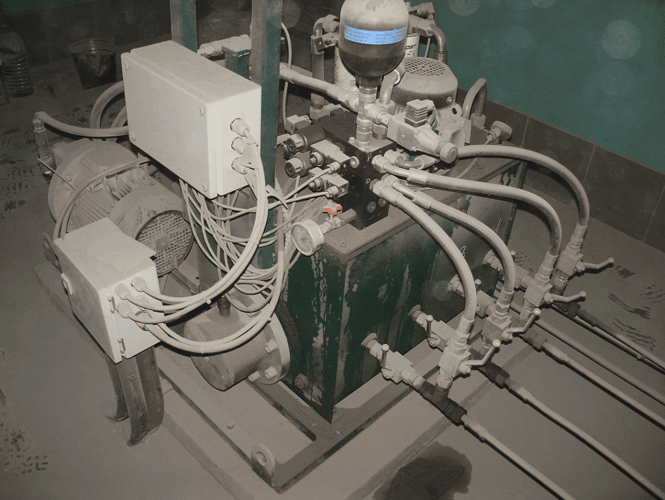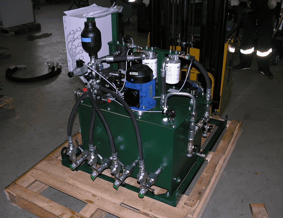 Электродвигатель (основной или резервный) приводит в работу шестеренный насос (основной или резервный), который всасывает масло из бака через всасывающий фильтр и нагнетает давление в гидросистему через напорный фильтр.