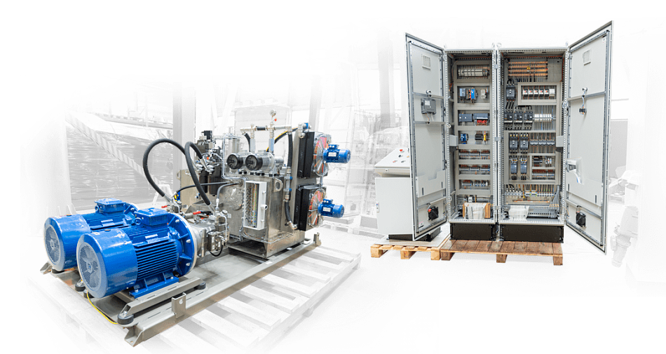Система электроуправления, поставляемая комплектно, полностью обеспечивает функционирование гидропривода. Система управления станции построена на базе контроллера S7-1200 с CPU не ниже 1215 и обеспечивает ручной и автоматический режимы работы с визуализацией оперативной и диагностической информации на графической панели оператора.