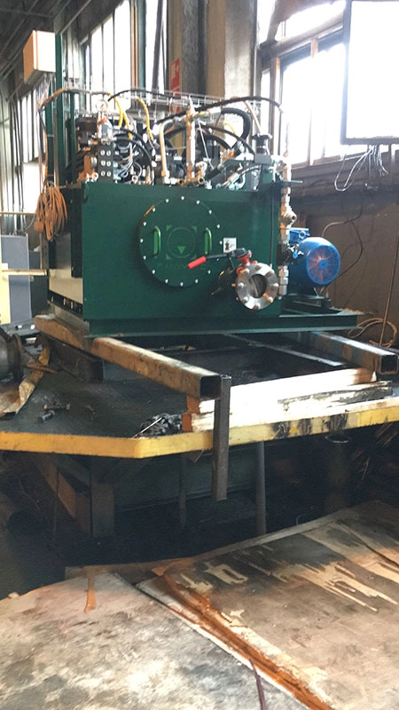 Гидравлическая станция состоит из гидробака объемом 1200 литров, основного насоса регулируемого с расходом в 150 л/мин, насоса управления с расходом 9,1 л/мин, давление 200+50 бар, двигатели 30+1,1 кВт.