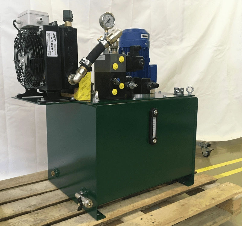 В состав гидростанции входит непосредственно гидравлическая силовая установка, гидроблок управления, установленный на крышку бака и вспомогательные элементы. На гидростанции имеется возможность регулировки скорости движения гидроцилиндра с помощью дроссельных регуляторов.