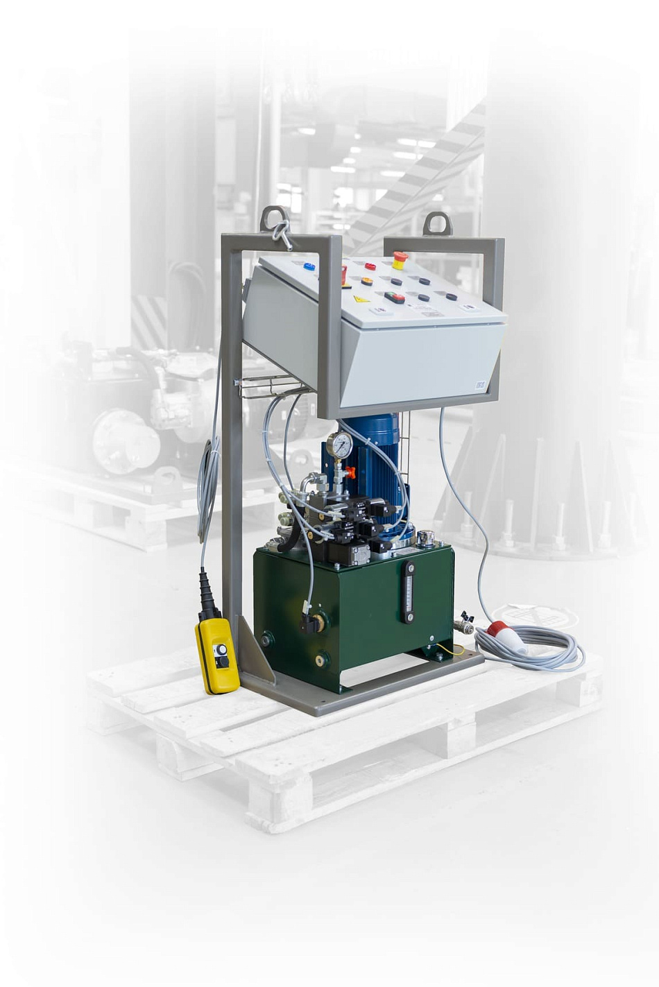 Электродвигатель с насосом, блок гидрораспределителя и фильтр обратной линии смонтированы на верхней поверхности масляного резервуара. Гидравлический блок состоит из шестеренчатого насоса, электродвигателя, опоры и соединительной втулки. Гидравлический блок монтируется на крышку масляного резервуара, что позволяет его легко заменить в процессе работы. Насос работает по принципу погружения, что подразумевает погружение всасывающего и напорного трубопроводов в масляный резервуар.