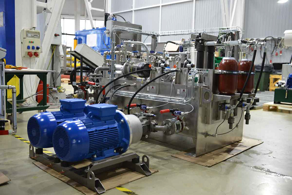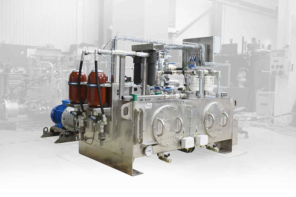 Для повышения надежности работы гидростанции использованы две дублирующие друг друга мотор-насосные группы, а также выполнен из нержавеющей стали гидравлический бак. В целях обеспечения требуемого расхода во время переходных процессов, в напорных выходах установлены гидроаккумуляторы баллонного типа объемом 5 литров каждый.