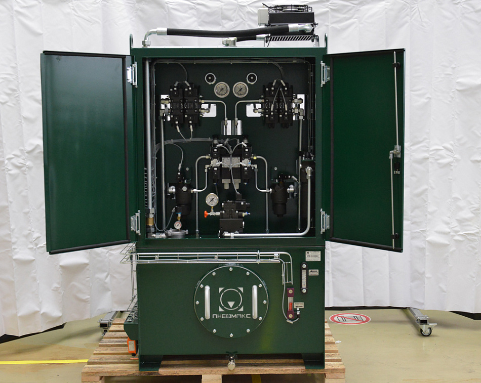 Согласно повышенным требованиям заказчика по промышленной эстетике, гидростанция выполнена в форм-факторе "гидравлического шкафа", т.е. вся аппаратура находится внутри закрытой металлоконструкции, за исключением мотор-насосных групп и теплообменника.