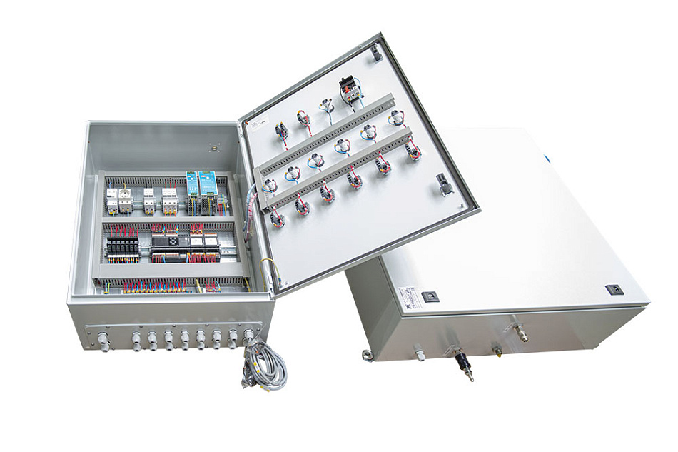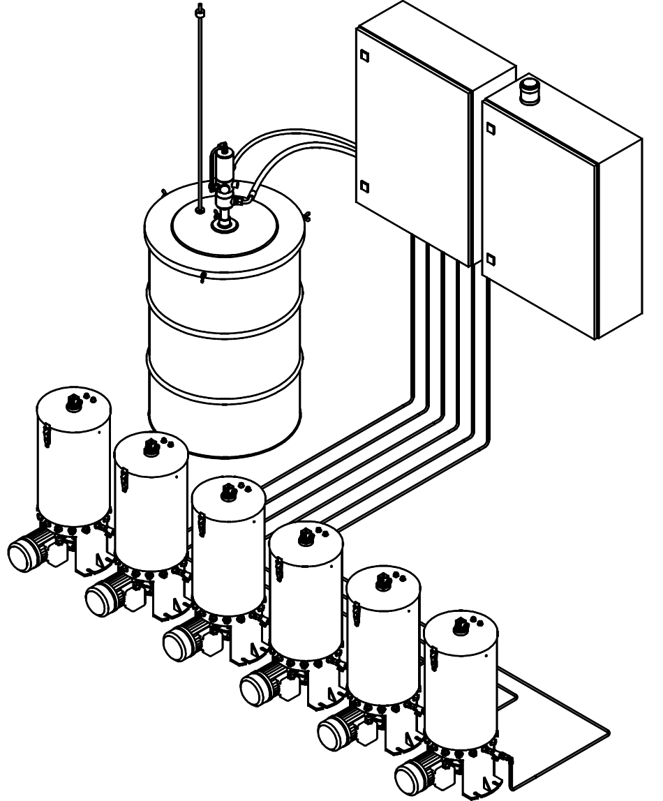 Насосная станция CTR-KV-C0247 служит для автоматической каскадной заправки 6-ти независимых станций смазки из бочки 200 кг при помощи пневматического насоса. Система включает в себя распределительный шкаф, шкаф управления, световую сигнализацию, датчики уровня смазки в баках.