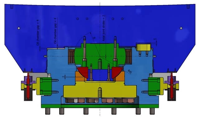 Наклонная способность в двух направлениях достигается благодаря сфере (зеленая) и ее сферическому седлу (темно-серая) и зазору между наружными уплотнительными поверхностями гидравлической камеры, являющимися центром вращения, расположенным в плоскости уплотнений.