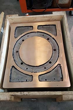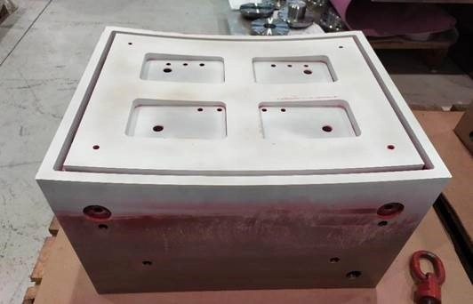 Метод Castolin позволяет использовать различные материалы для сварки, но в настоящее время мы рассматриваем возможность применения алюминиевой бронзы с твердостью от 80 до 90 HB и в любом случае ниже 100 HB. Твердость стальной ответной скользящей поверхности должна быть более 130 Hb. Ниже приведен пример гидростатической опоры после сварки методом Castolin, во время процесса обработки.