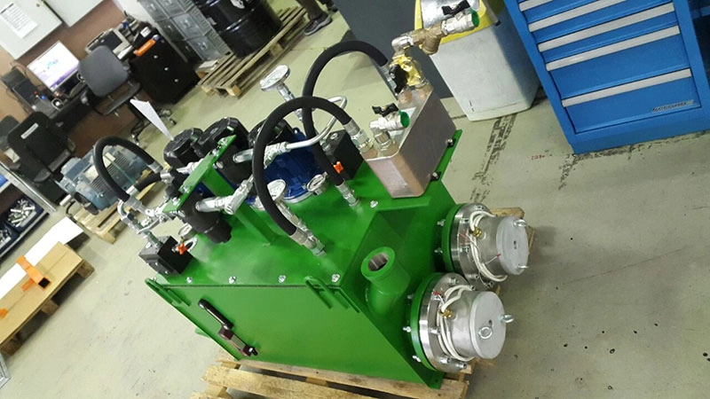 Гидростанция CTR-KV-C0005 состоит из гидробака объемом 250 литров нестандартной конструкции, двух мотор-насосных групп: основной и резервной, контура теплообмена и фильтрации рабочей жидкости, в состав которого входит водяной теплообменник, а также блока гидроаппаратуры с условным проходом Ду10.