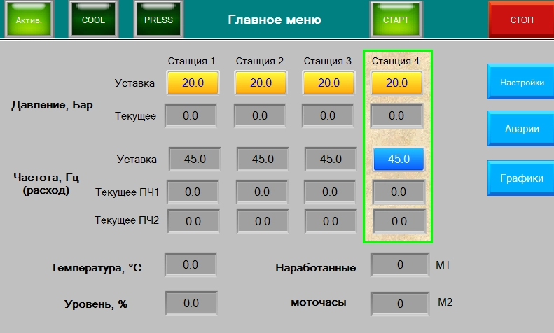 - пульт оператора с сенсорной панелью, на котором можно задавать величины требуемого расхода (за счет изменения частоты потребляемого тока на электродвигателях) и максимального рабочего давления в системе.